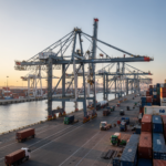 A busy modern container quay at sunrise with quay cranes lifting containers from a large container ship, yard stacks in the background, and trucks moving containers to the gate