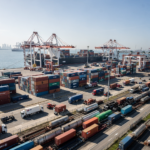A schematic overhead view of a busy container terminal showing quay cranes, stacks, trucks, and a control tower, realistic photographic style, no text